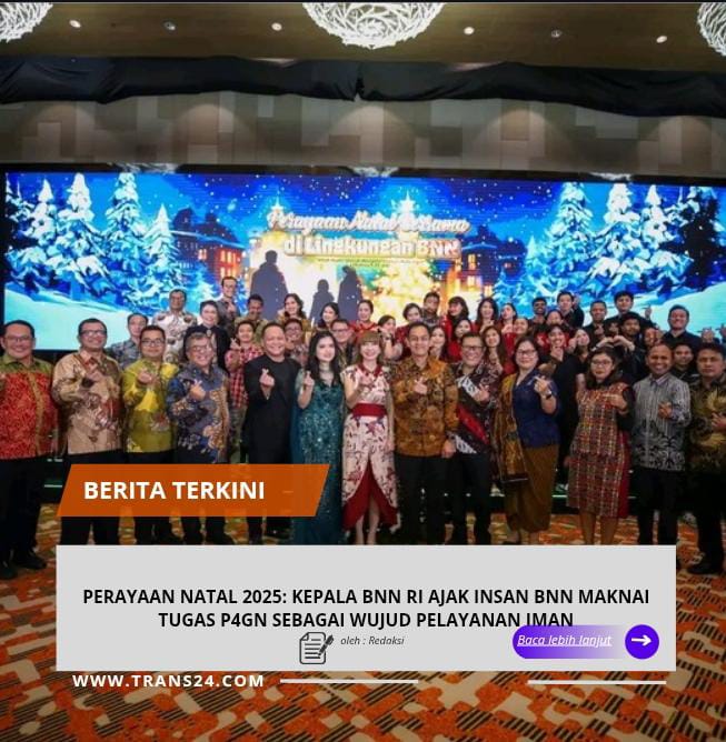 Jakarta, // trans24.id //-Suasana hangat dan penuh sukacita menyelimuti Perayaan Natal Bersama yang digelar oleh Badan Narkotika Nasional (BNN) di Grand Mercure Kemayoran, Jakarta Pusat, pada Kamis (29/1). Bukan sekadar seremoni tahunan, perayaan ini menjadi ruang untuk berhenti sejenak dari rutinitas tugas, merenungkan kasih Tuhan, serta mempererat ikatan kebersamaan di antara sesama insan BNN.