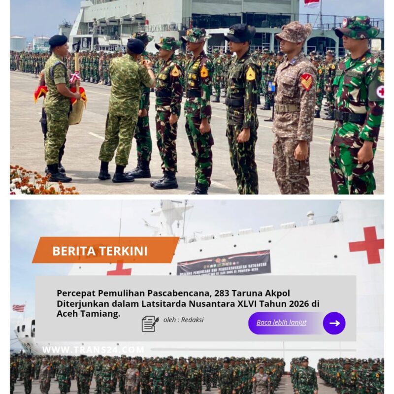 Aceh Tamiang, // trans24.id //-Polri kembali menunjukkan komitmen nyata dalam mendukung pemulihan wilayah terdampak bencana. Sebanyak 283 taruna tingkat akhir Akademi Kepolisian (Akpol) yang tergabung dalam Batalyon Ksatriya Hawin Sarwahita resmi diberangkatkan untuk mengikuti Latihan Integrasi Taruna Wreda Nusantara (Latsitarda Nusantara) XLVI Tahun 2026.