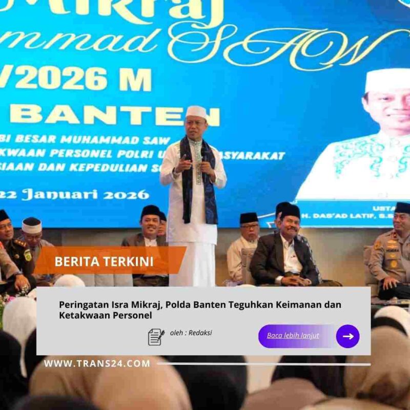 Serang, // trans24.id // – Polda Banten menggelar peringatan Isra Mikraj Nabi Muhammad SAW yang mengusung tema “Isra Mikraj Nabi Besar Muhammad SAW memperteguh keimanan dan ketakwaan personel Polri untuk masyarakat dalam aksi kemanusiaan dan kepedulian sosial”. Kegiatan tersebut bertempat di Aula Gawekuta Baluarti Polda Banten pada Kamis (22/01).
