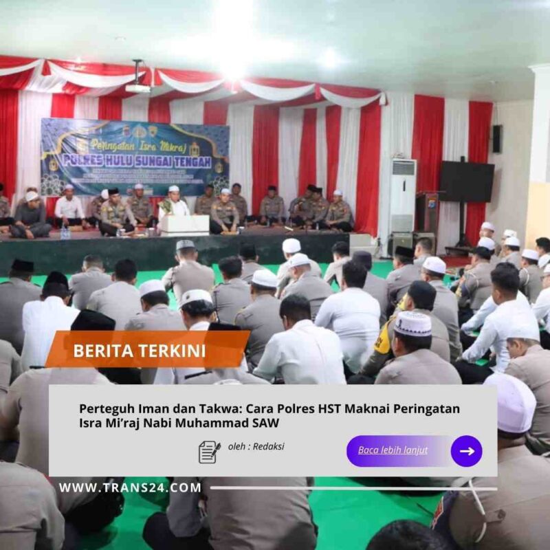 Kalimantan Selatan, // trans24.id //-Polres Hulu Sungai Tengah Polda Kalimantan Selatan Polres HST memperingati Isra Mi’raj Nabi Muhammad SAW 1447 Hijriah / 2026 M ” Hikmah Isra Mi’raj Nabi Muhammad S.A.W. Memperteguh Keimanan dan Ketaqwaan Personel Polri Untuk Masyarakat Dalam Aksi Kemanusiaan dan Kepedulian Sosial ” sebagai momentum untuk meningkatkan keimanan, ketakwaan, serta penguatan nilai moral dan integritas personel Polri dalam menjalankan tugas pengabdian kepada masyarakat, Senin (19/1/2026).