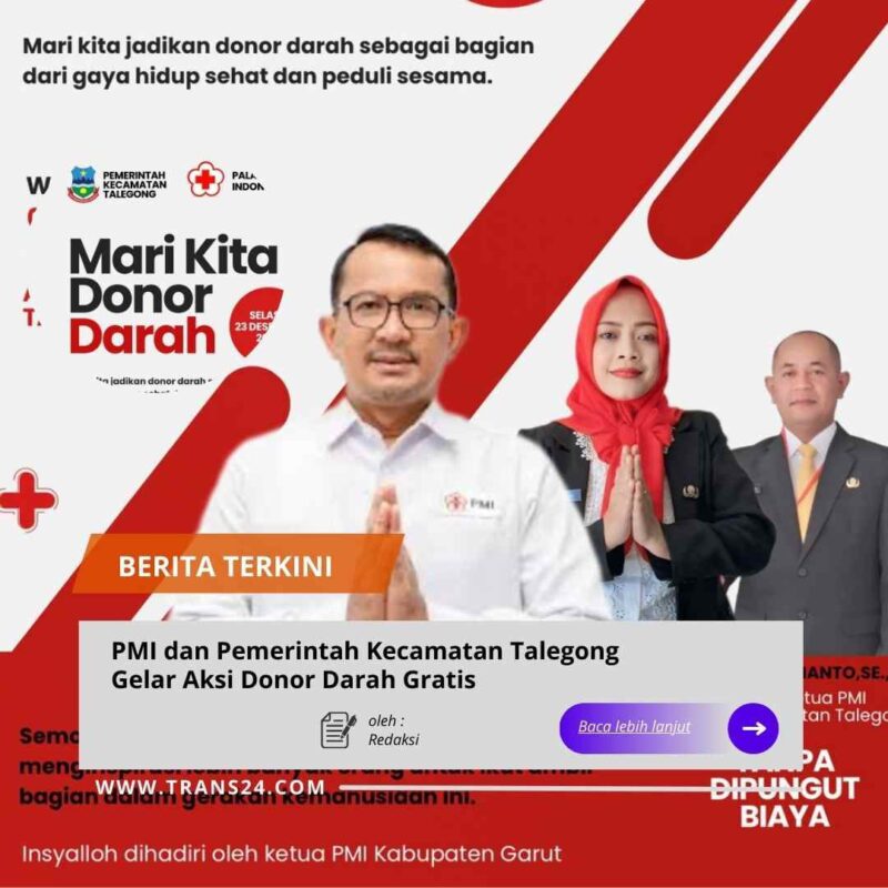 Garut // trans24.id — Palang Merah Indonesia (PMI) bekerja sama dengan Pemerintah Kecamatan Talegong akan menggelar kegiatan Donor Darah sebagai bentuk kepedulian sosial dan kemanusiaan. Kegiatan ini dijadwalkan berlangsung pada Selasa, 23 Desember 2025, mulai pukul 08.00 WIB hingga selesai, bertempat di Aula Kecamatan Talegong.