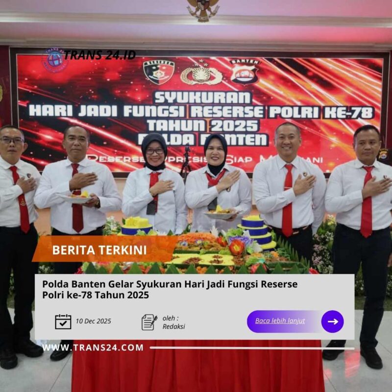 Serang//trans24.id – Polda Banten menggelar Syukuran Hari Jadi Fungsi Reserse Polri ke-78 Tahun 2025 dengan tema “Reserse Presisi Siap Melayani”, Kegiatan berlangsung di Aula Serbaguna Polda Banten pada Jumat (12/12).