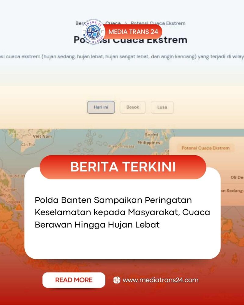 Serang//trans24.id – Polda Banten kembali mengimbau masyarakat untuk meningkatkan kewaspadaan terhadap potensi cuaca ekstrem berdasarkan pembaruan informasi dari Badan Meteorologi Klimatologi dan Geofisika (BMKG) per Senin (08/12). BMKG memprakirakan sebagian besar wilayah Provinsi Banten berpotensi mengalami hujan dengan intensitas sedang hingga lebat.