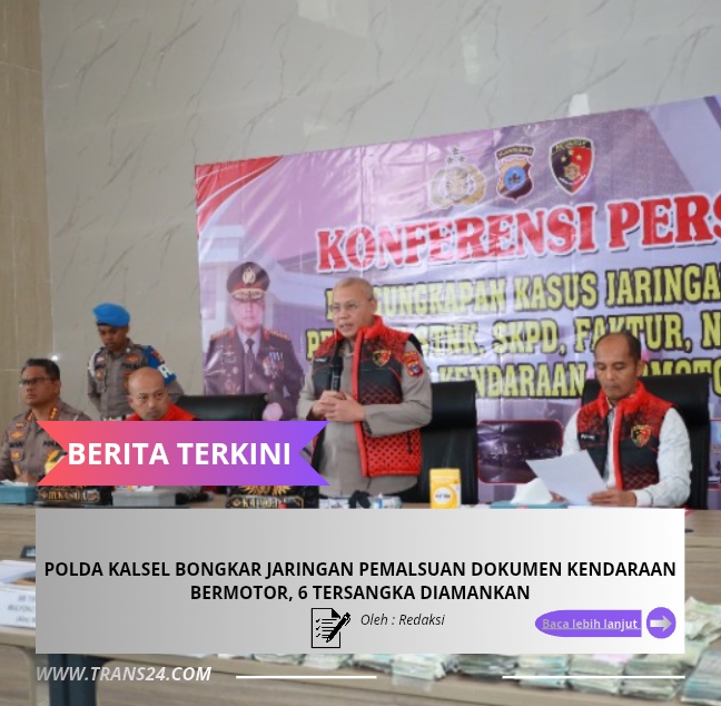 Kalimantan Selatan, // trans24.id – Direktorat Reserse Kriminal Umum (Ditreskrimum) Polda Kalimantan Selatan menggelar konferensi pers terkait pengungkapan kasus jaringan pemalsuan dokumen kendaraan bermotor, Kamis (19/2/2026) pagi. Konferensi pers yang berlangsung di Lobby Mapolda Kalsel, Banjarbaru ini dipimpin langsung oleh Kapolda Kalsel didampingi Irwasda, Dir Reskrimum, Dir Lantas, dan Kabid Humas Polda Kalsel.