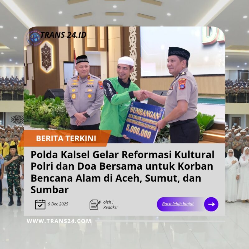 SUMUT//trans24.id – Kepolisian Daerah Kalimantan Selatan (Polda Kalsel) menggelar kegiatan Integrasi Nilai-Nilai Reformasi Kultural Polri yang dipadukan dengan doa bersama untuk korban bencana alam di Aceh, Sumatera Utara, dan Sumatera Barat, Selasa (9/12/2025).