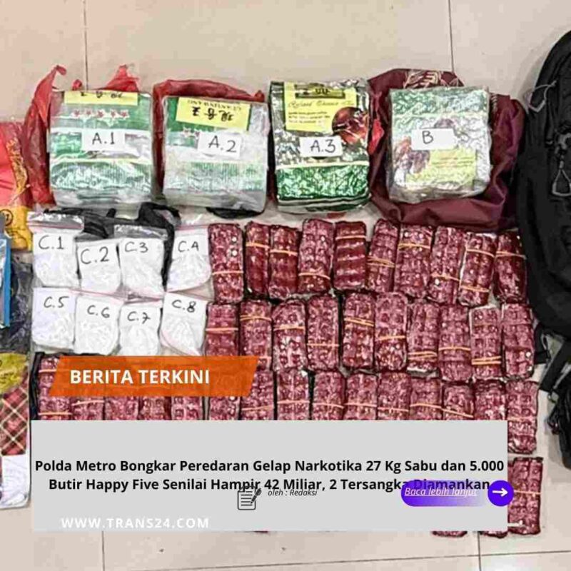 Jakarta, // trans24.id //– Direktorat Reserse Narkoba Polda Metro Jaya mengungkap kasus peredaran narkotika skala besar , mengamankan barang bukti sabu dengan berat brutto 27,168 kilogram dan 5.000 butir psikotropika Happy Five (H5). Dalam pengungkapan ini, polisi mengamankan 2 orang tersangka berinisial D (36) laki-laki, dan S (45) laki-laki.