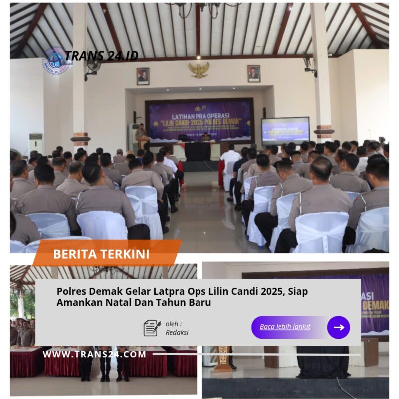 Demak//trans24.id – Polres Demak menggelar Latihan Pra Operasi (Latpra Ops) Lilin Candi 2025 di Pendopo Parama Satwika, Kamis (18/12/2025), sebagai kesiapan pengamanan perayaan Natal 2025 dan Tahun Baru 2026 di Kabupaten Demak.