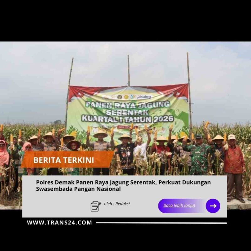 Demak //trans24.id Polres Demak melaksanakan kegiatan Panen Raya Jagung Serentak Kuartal I Tahun 2026 sebagai bentuk dukungan terhadap Program Swasembada Pangan Nasional. Kegiatan tersebut dipimpin langsung oleh Kapolres Demak AKBP Ari Cahya Nugraha di Desa Sumberejo, Kecamatan Mranggen, Kamis (8/1/2026).