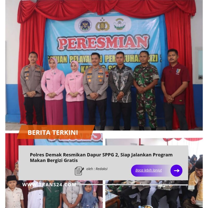 Demak, // trans24.id //-Kapolres Demak AKBP Arrizal Samelino Gandasaputra meresmikan Dapur Satuan Pelayanan Pemenuhan Gizi (SPPG) Polres Demak 2 yang berlokasi di Desa Karangsono, Kecamatan Mranggen, Kabupaten Demak, Jumat (23/1/2026).