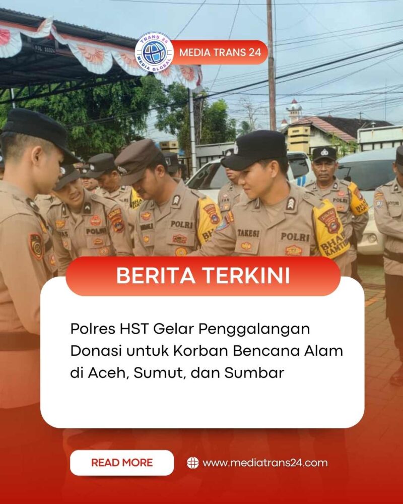 Kalimantan Selatan//trans24.id — Sebagai wujud kepedulian dan solidaritas terhadap sesama, Polres Hulu Sungai Tengah Polda Kalimantan Selatan menggelar penggalangan donasi untuk membantu korban bencana alam yang terjadi di Aceh, Sumatera Utara, dan Sumatera Barat. Kegiatan ini dilaksanakan usai apel pagi di halaman Mapolres HST, Kamis (4/12/2025).