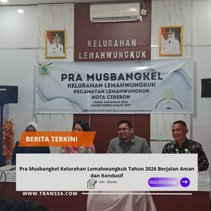 Cirebon Kota, // trans24.id //- Dalam rangka menyusun rencana pembangunan tingkat kelurahan untuk tahun 2026, jajaran Polsek Lemahwungkuk bersama Bhabinkamtibmas Kelurahan Lemahwungkuk Aiptu Sugito dan Babinsa Kelurahan Lemahwungkuk Sertu Amar turut hadir memantau jalannya kegiatan Pra Musbangkel yang berlangsung di Aula Kantor Kelurahan Lemahwungkuk, Kecamatan Lemahwungkuk, Kota Cirebon pada Jumat (23/01/2026) pukul 09.00 WIB hingga selesai, dengan situasi tetap aman, tertib, dan kondusif selama kegiatan berlangsung.