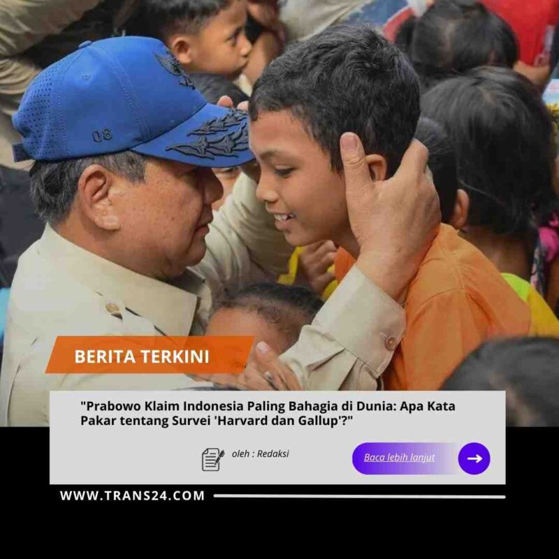 JAKARTA//trans24.id – Kebahagiaan warga Indonesia tidak berkaitan erat dengan kebijakan pemerintah, melainkan relasi dan solidaritas antarwarga yang ditanamkan turun-temurun, menurut sejumlah pakar. Jadi apa yang keliru dan apa yang benar dari klaim Prabowo soal kebahagiaan WNI? Pada Perayaan Natal Nasional 2025 di Lapangan Tenis Indoor Senayan, Jakarta, Senin (5/01).