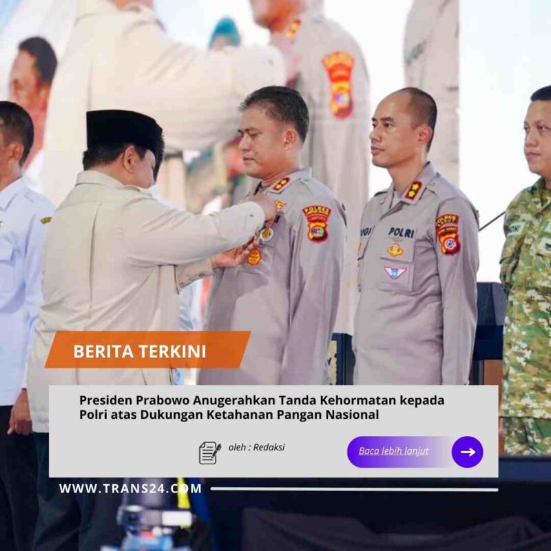 Karawang //trans24.idKepolisian Negara Republik Indonesia (Polri) menerima penghargaan dari Presiden Republik Indonesia Prabowo Subianto atas kontribusi nyata dalam mendukung penguatan ketahanan pangan nasional yang menjadi bagian dari agenda Asta Cita Presiden.