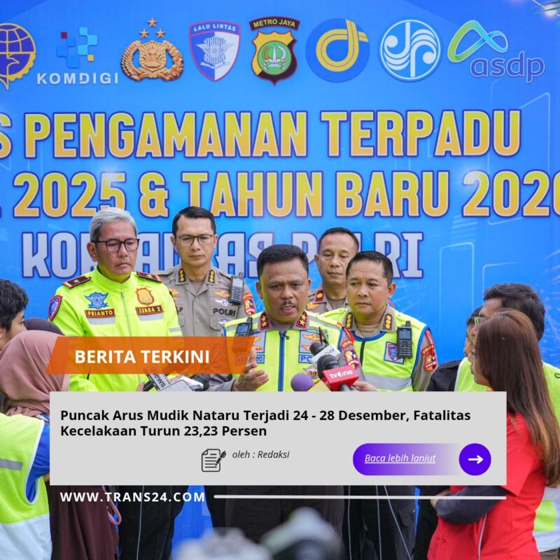 Bekasi//trans24.id – Kepala Korps Lalu Lintas (Kakorlantas) Polri Irjen Pol Agus Suryonugroho menyampaikan bahwa angka fatalitas kecelakaan lalu lintas selama arus mudik libur Natal dan Tahun Baru (Nataru) mengalami penurunan signifikan.