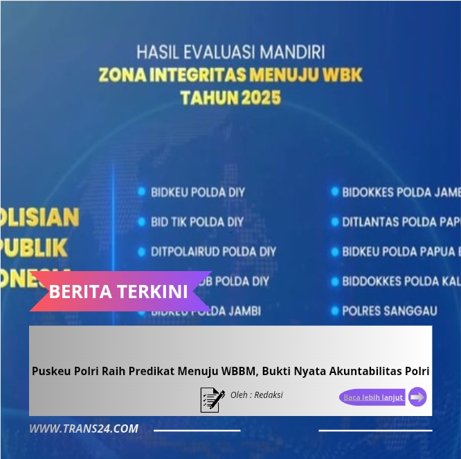 Jakarta, // trans24.id – Pusat Keuangan (Puskeu) Polri menorehkan prestasi penting di tingkat nasional. Satuan kerja di lingkungan Mabes Polri tersebut berhasil meraih predikat Zona Integritas Menuju Wilayah Birokrasi Bersih Melayani (WBBM) Tahun 2025 dalam ajang SAKIP dan ZI Award 2025 yang diselenggarakan Kementerian Pendayagunaan Aparatur Negara dan Reformasi Birokrasi (PANRB)