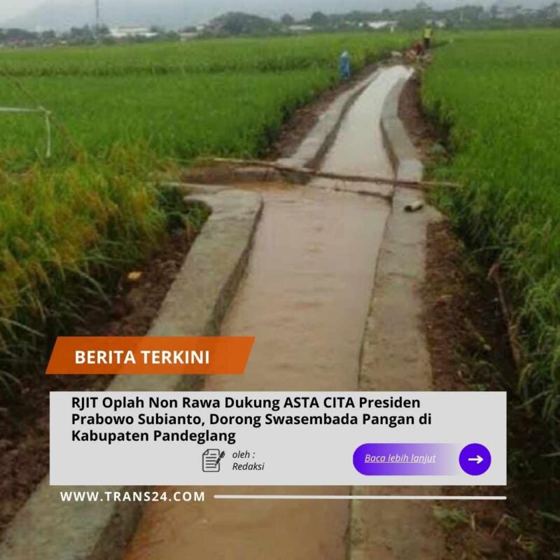 Pandeglang//trans24.id – Dalam rangka mendukung pelaksanaan ASTA CITA Presiden Republik Indonesia, Bapak Prabowo Subianto, khususnya pada agenda Swasembada Pangan, pemerintah terus mendorong pelaksanaan berbagai program strategis di sektor pertanian. Salah satu program yang dinilai memberikan dampak nyata bagi petani adalah Rehabilitasi Jaringan Irigasi Tersier (RJIT) Oplah Non Rawa, yang dilaksanakan di sejumlah wilayah Kabupaten Pandeglang, termasuk Kecamatan Pagelaran, Provinsi Banten.jum’at (19/12/2025).