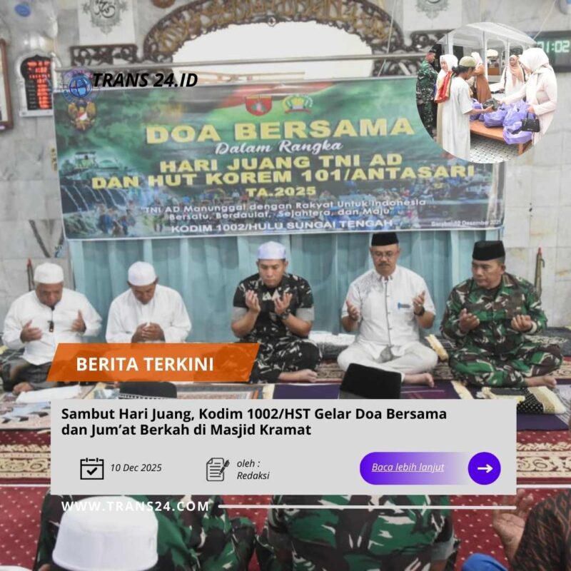BARABAI//trans24.id  — Menyongsong peringatan Hari Juang TNI AD ke-80 dan Hari Ulang Tahun Korem 101/Antasari pada 15 Desember 2025, prajurit Kodim 1002/Hulu Sungai Tengah (HST) melaksanakan Doa Bersama di Masjid Kramat Desa Pelajau, Kecamatan Pandawan, Kabupaten HST, Jumat (12/12/25).
