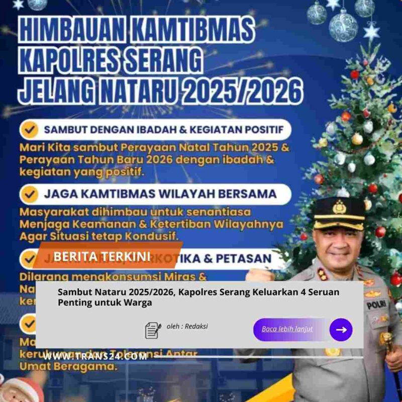 SERANG//trans24.id– Memastikan perayaan Natal 2025 dan Tahun Baru 2026 berlangsung damai, Kapolres Serang mengeluarkan imbauan Kamtibmas bagi seluruh lapisan masyarakat. Pesan ini bertujuan menciptakan suasana yang kondusif di wilayah hukum Polres Serang.