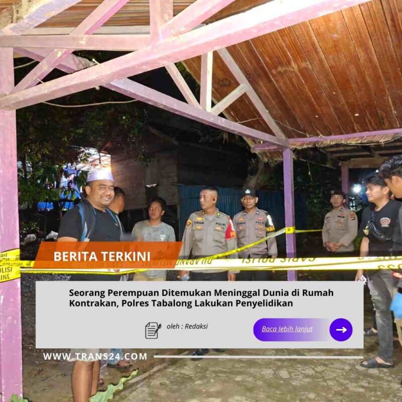 Tabalong //trans24.id Polres Tabalong menindaklanjuti laporan penemuan seorang perempuan yang ditemukan dalam keadaan meninggal dunia di sebuah rumah kontrakan yang berada di Jalan Gunung Batu RT 21, Desa Unggung, Kelurahan Belimbing, Kecamatan Murung Pudak, Kabupaten Tabalong, pada Minggu (11/1/2026) sekitar pukul 03.05 Wita.