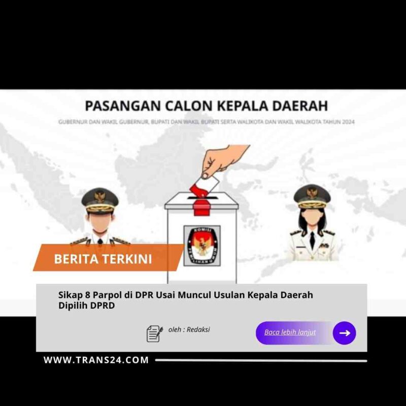 Jakarta//trans24.id – Muncul usulan dari partai politik (parpol) untuk pemilihan kepala daerah (pilkada) dipilih melalui DPRD. Bagaimana sikap 8 parpol di DPR terhadap usulan kepala daerah tak dipilih langsung tersebut? Usulan kepala daerah dipilih lewat DPRD muncul seusai Rapat Pimpinan Nasional (Rapimnas) 1 Tahun 2025 Partai Golkar. Dalam Rapimnas Golkar, menghasilkan keputusan salah satunya terkait pilkada melalui DPRD hingga pembentukan koalisi permanen.