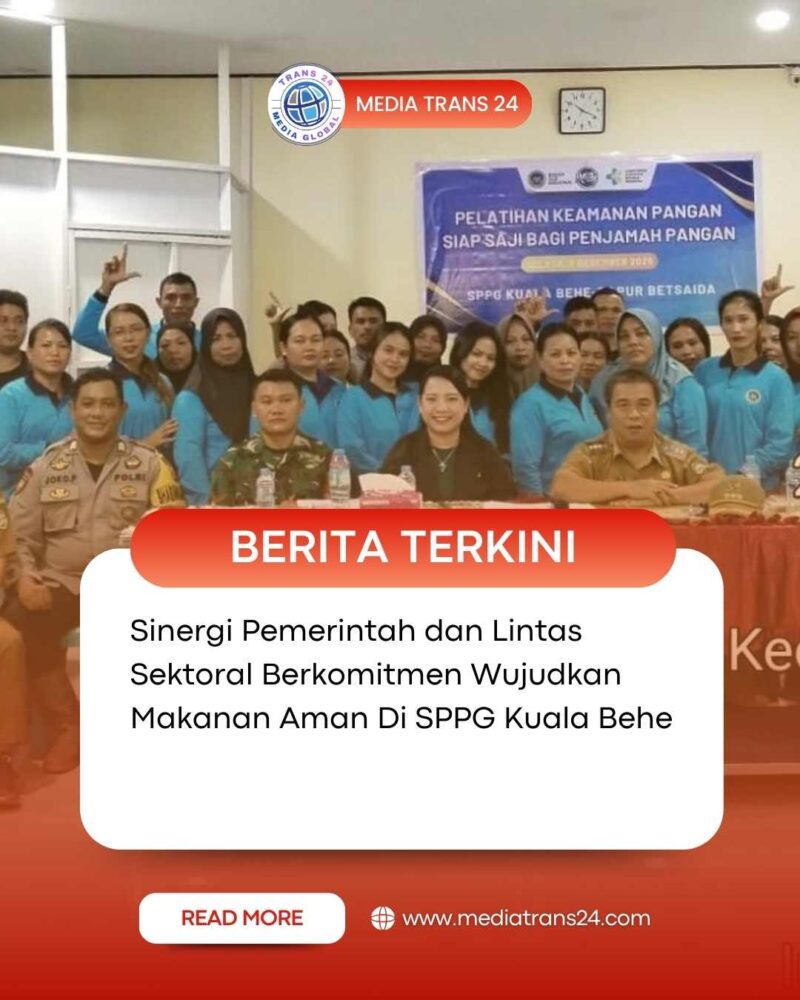 KUALA BEHE, LANDAK//trans24.id – Kapolsek Kuala Behe IPTU Eko Kurniawan S.H., M.H., melalui Bhabinkamtibmas Polsek Kuala Behe Brigadir Djoko Puji Santosa menghadiri undangan kegiatan Pelatihan Penjamah Makanan bagi para pengelola dan penjamah makanan di wilayah SPPG Kuala Behe. Kegiatan ini bertujuan meningkatkan pengetahuan serta keterampilan peserta dalam menjaga keamanan, mutu, dan higienitas makanan yang disajikan kepada masyarakat. Selasa (2/12/3025).