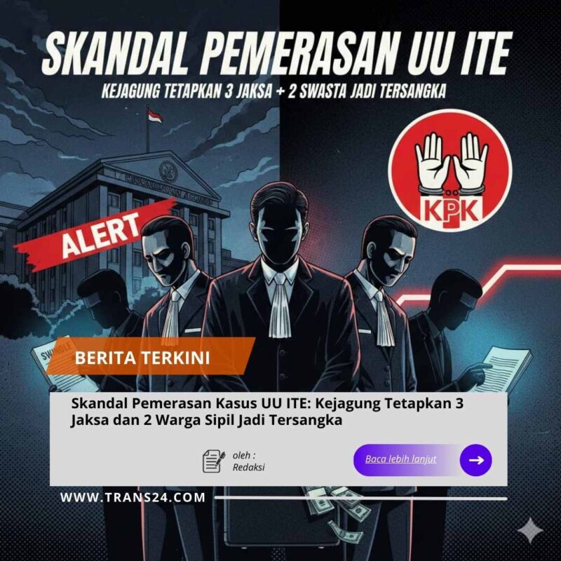 JAKARTA//trans24.id  – Kejaksaan Agung (Kejagung) resmi menetapkan lima orang tersangka dalam kasus dugaan pemerasan terkait penanganan perkara Undang-Undang Informasi dan Transaksi Elektronik (UU ITE). Ironisnya, tiga dari lima tersangka tersebut merupakan oknum jaksa aktif yang menduduki jabatan strategis di wilayah Banten.