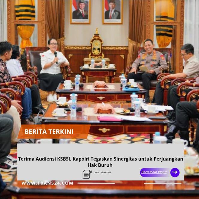 Jakarta, // trans24.id // – Kapolri Jenderal Listyo Sigit Prabowo menerima audiensi dari Konfederasi Serikat Buruh Seluruh Indonesia (KSBSI). Dalam kesempatan tersebut, Sigit menegaskan bakal terus perkuat sinergitas untuk memperjuangkan hak buruh.