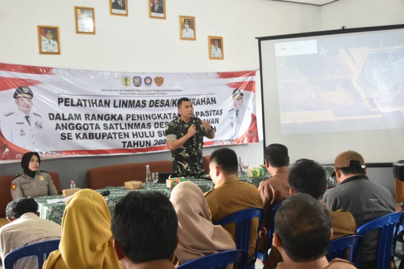 BARABAI // trans24.id – Komandan Kodim 1002/HST Letkol Inf Ardiansyah Okta Putra Siregar memberikan materi Bela Negara pada kegiatan Pelatihan Linmas Desa/Kelurahan dalam rangka meningkatkan kapasitas anggota Satlinmas se-Kecamatan Barabai Dan Pandawa. Kegiatan tersebut berlangsung di Aula Kantor Desa Benawa Tengah, Kecamatan Barabai, Senin (24/11/2025).