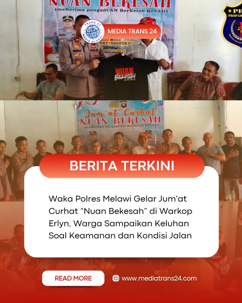 Polres Melawi Polda Kalbar//trans24.id – Kegiatan Jum’at Curhat Nuan Bekesah kembali digelar Polres Melawi sebagai sarana menampung aspirasi dan keluhan masyarakat terkait situasi kamtibmas. Pada Jumat (5/12/2025), Waka Polres Melawi Kompol Aang Permana, S.I.P., S.H., M.A.P., memimpin langsung kegiatan yang berlangsung di Warkop Erlyn, Desa Pemuar, Kecamatan Belimbing.