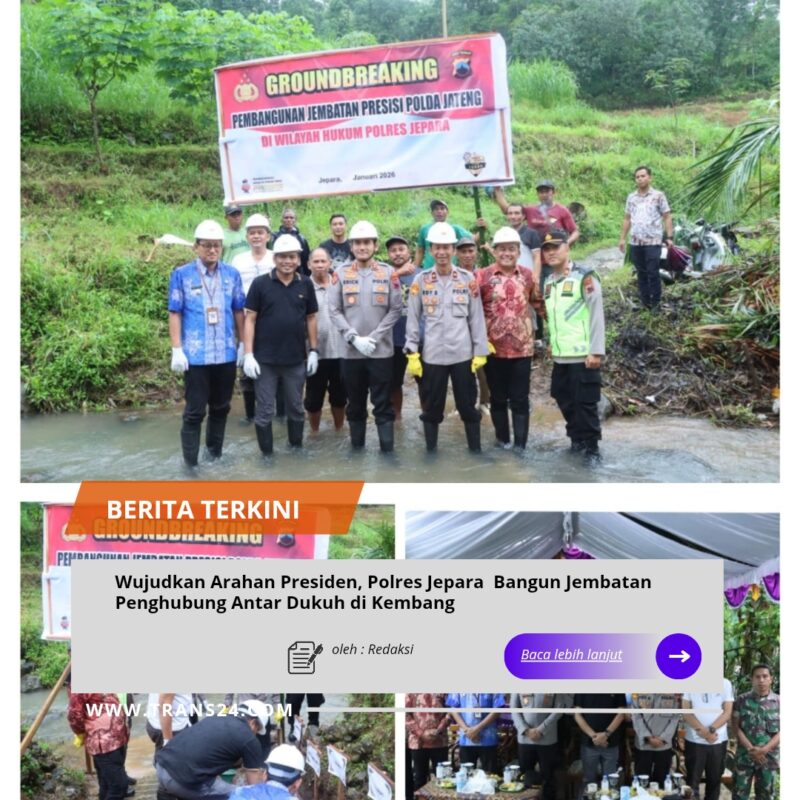 Jepara//trans24.id – Kepolisian Resor (Polres) Jepara, Polda Jawa Tengah, resmi memulai proyek pembangunan jembatan yang menghubungkan Dukuh Krajan dengan Dukuh Bleber di Desa Bucu, Kecamatan Kembang, Kabupaten Jepara, pada Jumat (9/1/2026).